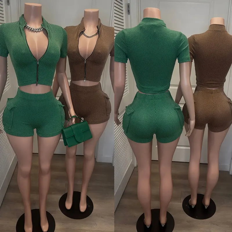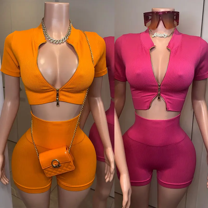 Manufacturer Short Sleeve Crop Top & Shorts 2025 Loungewear Custom logo Activewear Yoga Wear Women's Sets Two Piece with Zipper